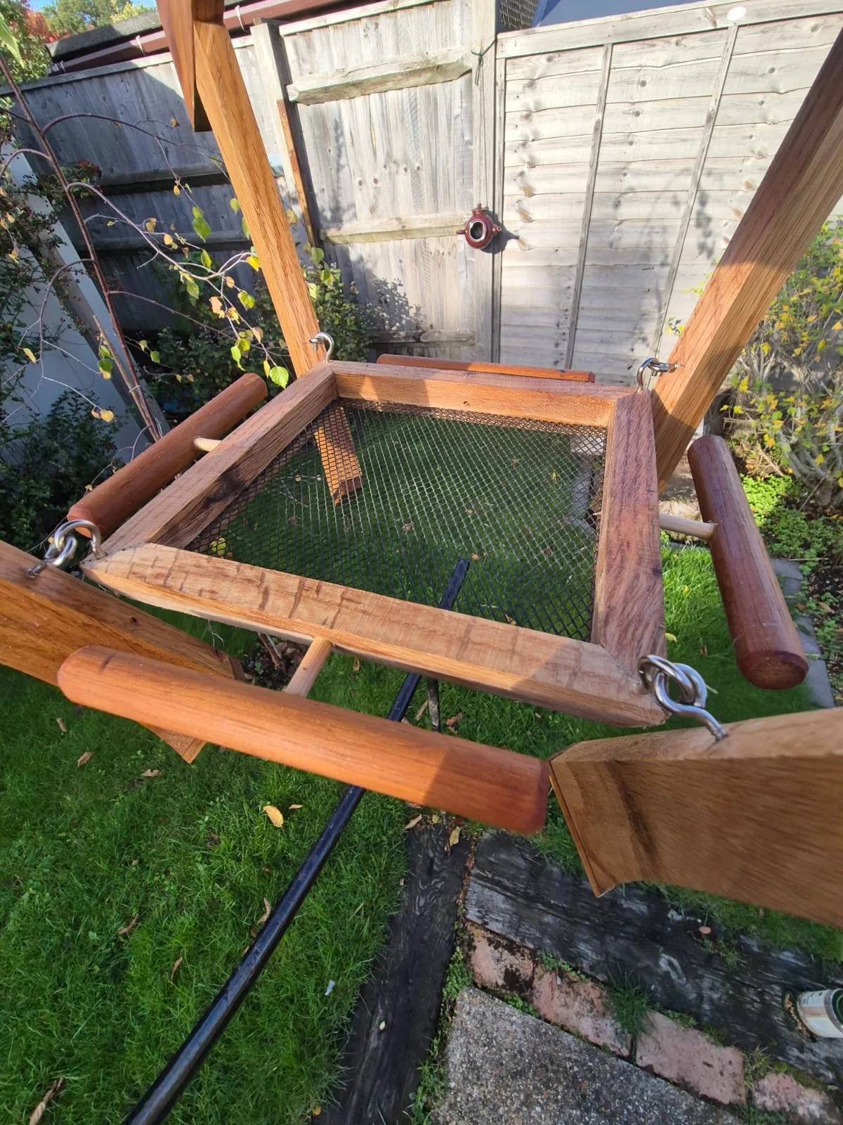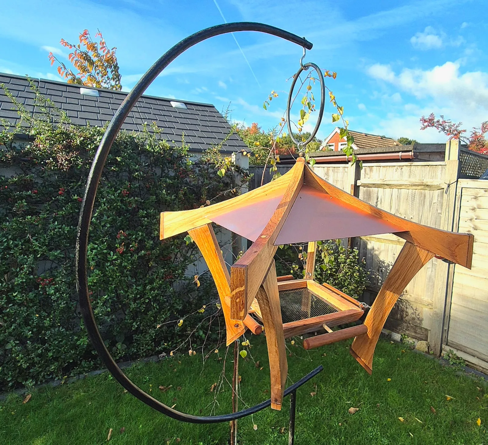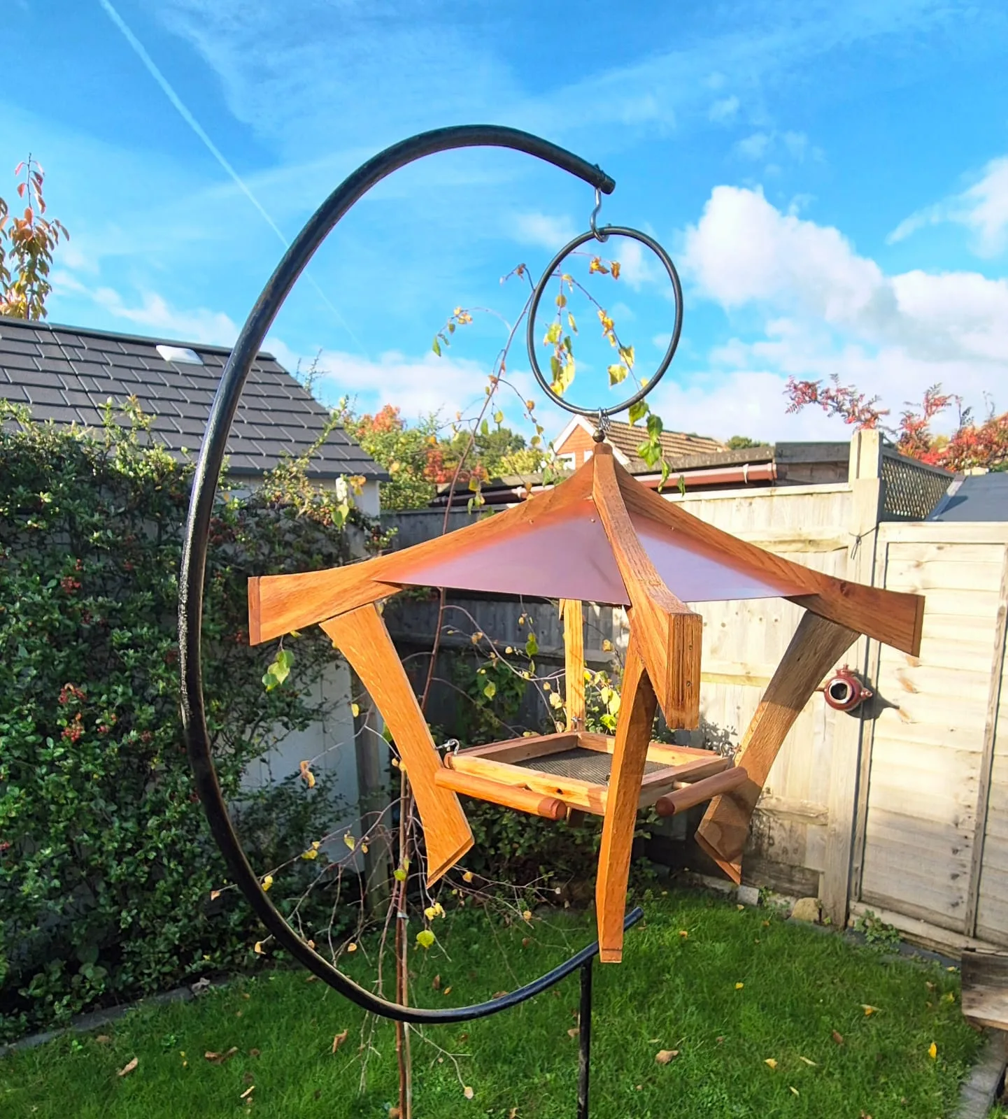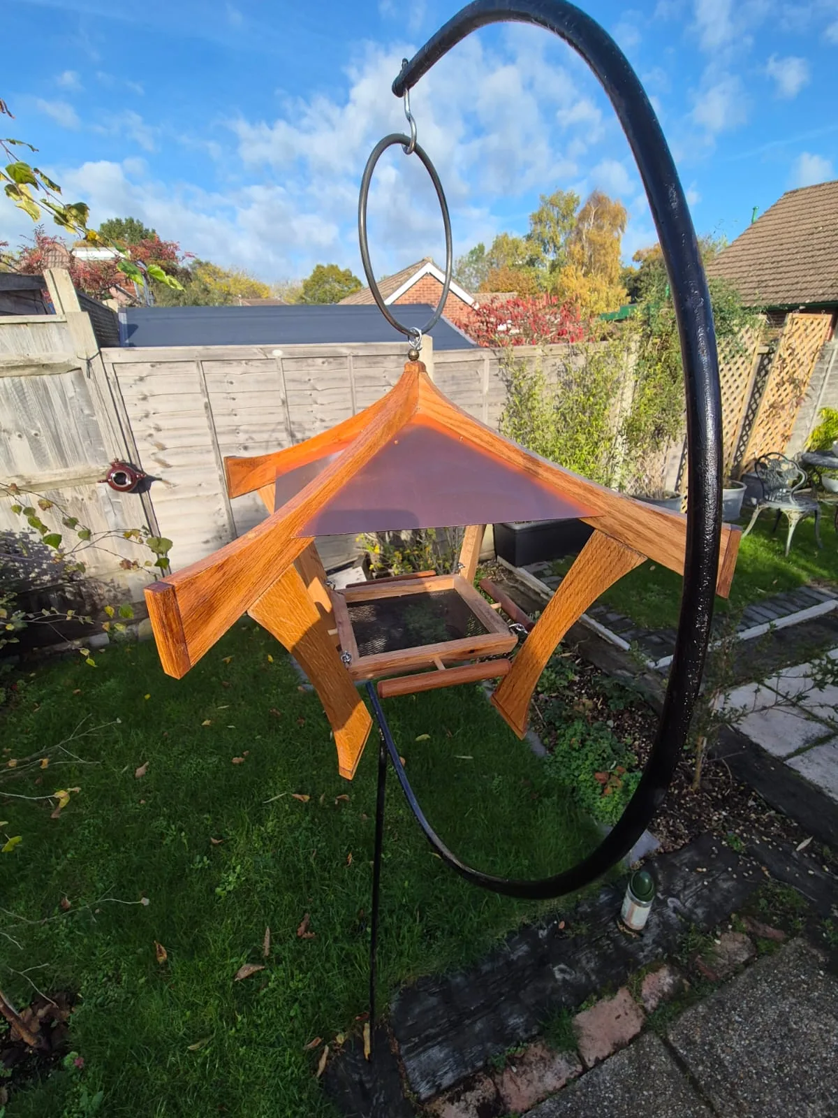 Only quality materials have been used in this construction, the framework has been jointed rather than nailed or screwed together. This bird table has been designed and built for its asthetic beauty its natural balance sustainability, and resiliance. Whilst this stunning birdtable can be hung from a tree branch it does come with a uniquely designed stand.
